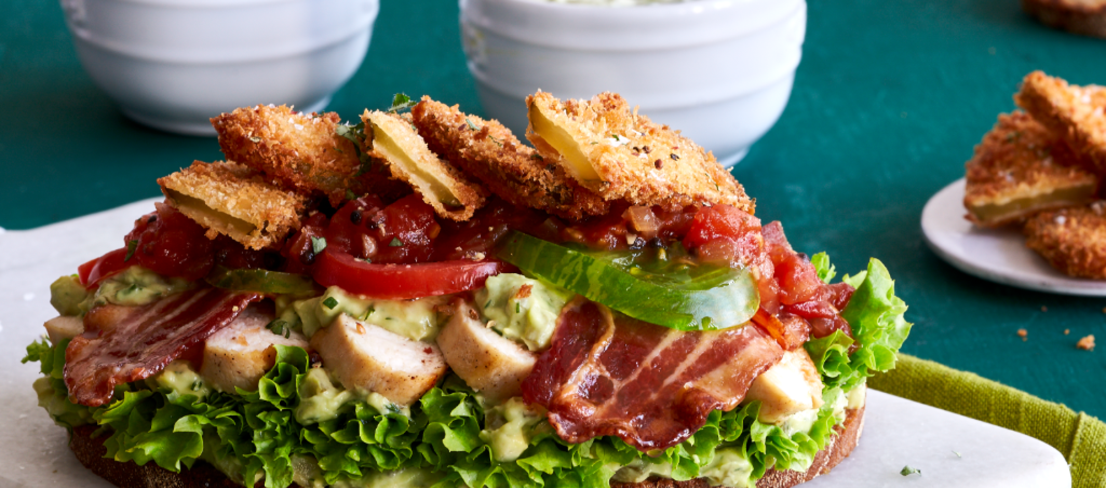 Zum Servieren Hähnchenbrustfilets in Tranchen schneiden. Brotscheiben mit Avocado-Creme bestreichen, mit Salat, Hähnchen, Bacon und Tomaten belegen. Etwas Chutney auf die Sandwiches geben und mit frittierten Gurken toppen.