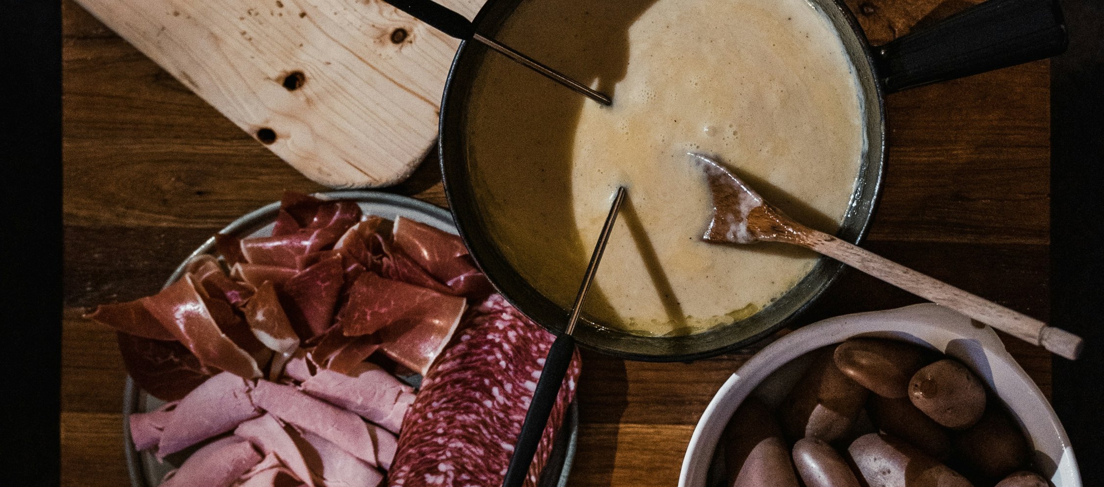 Sobald die Gäste versammelt sind, Fleisch, Gemüse, Kartoffeln und die Saucen auftragen. Jeder Gast gart sich seine Zutaten in der Fleischbrühe selbst.