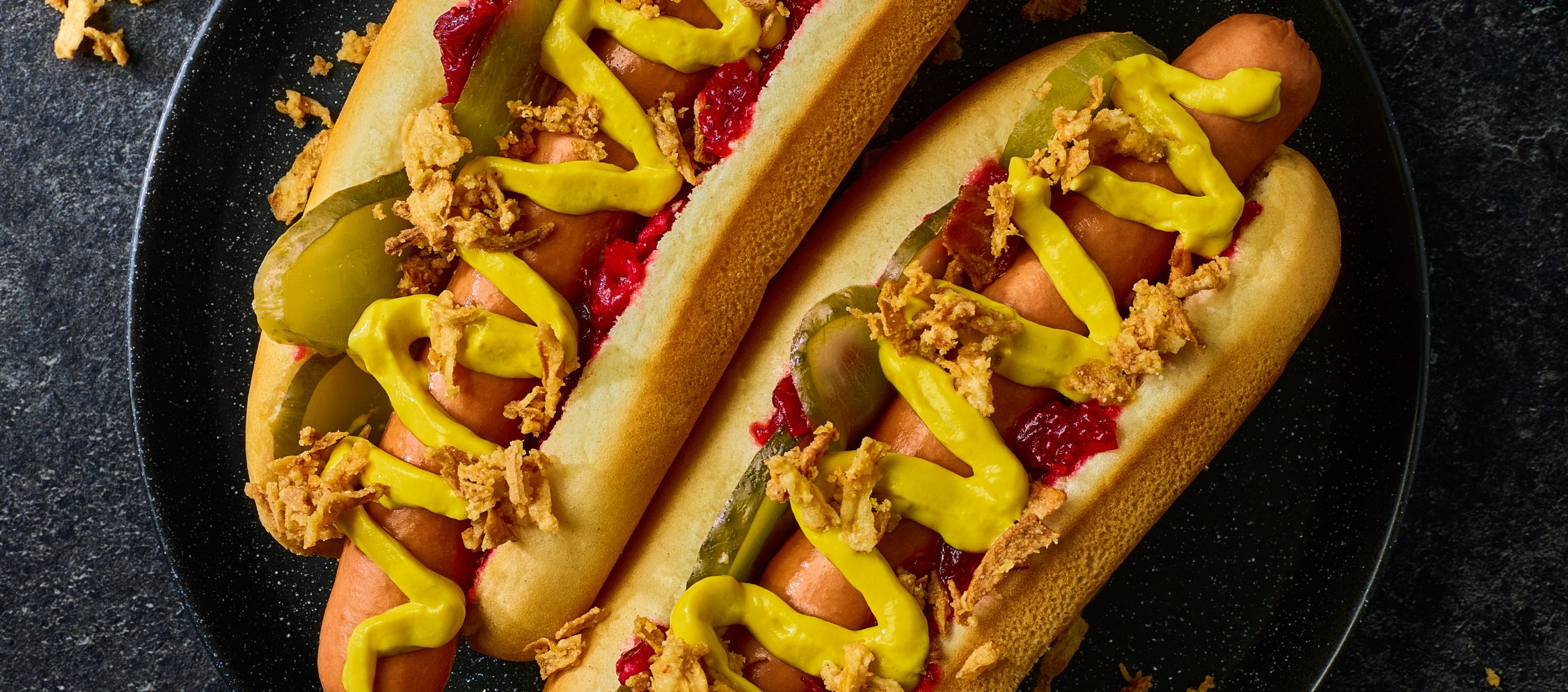 Hotdog-Würstchen in einem Topf in siedendem Wasser erhitzen. Sandwichgurken abtropfen lassen. Je ein Hotdog-Brötchen mit etwas Marmelade bestreichen, mit Sandwichgurken und Würstchen belegen, mit etwas Senf und Röstzwiebeln anrichten und servieren.