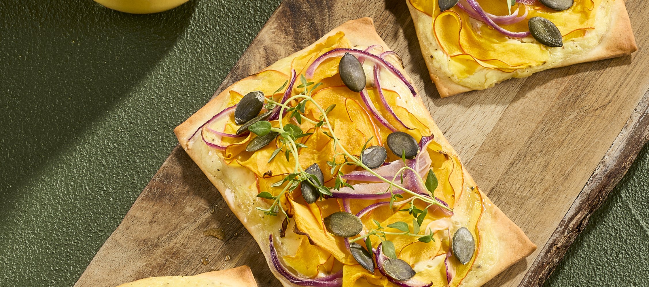 Den Flammkuchenteig ausrollen und in 8 gleich große Stücke schneiden. Die Crème-fraîche-Senf-Mischung gleichmäßig auf alle Flammkuchenstücke verteilen und mit Kürbis- und Zwiebelstreifen belegen.