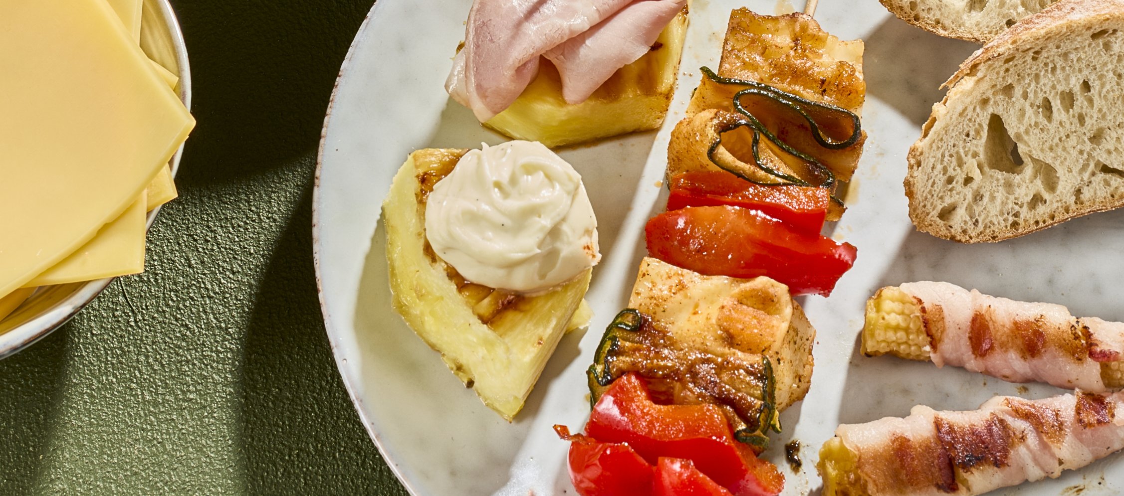 Küchenwaage, Raclettegrill, Schneidebrett, Küchenmesser, Gemüsehobel, Holzspieße, Schüsseln, Küchenpinsel, kleine Grillzange