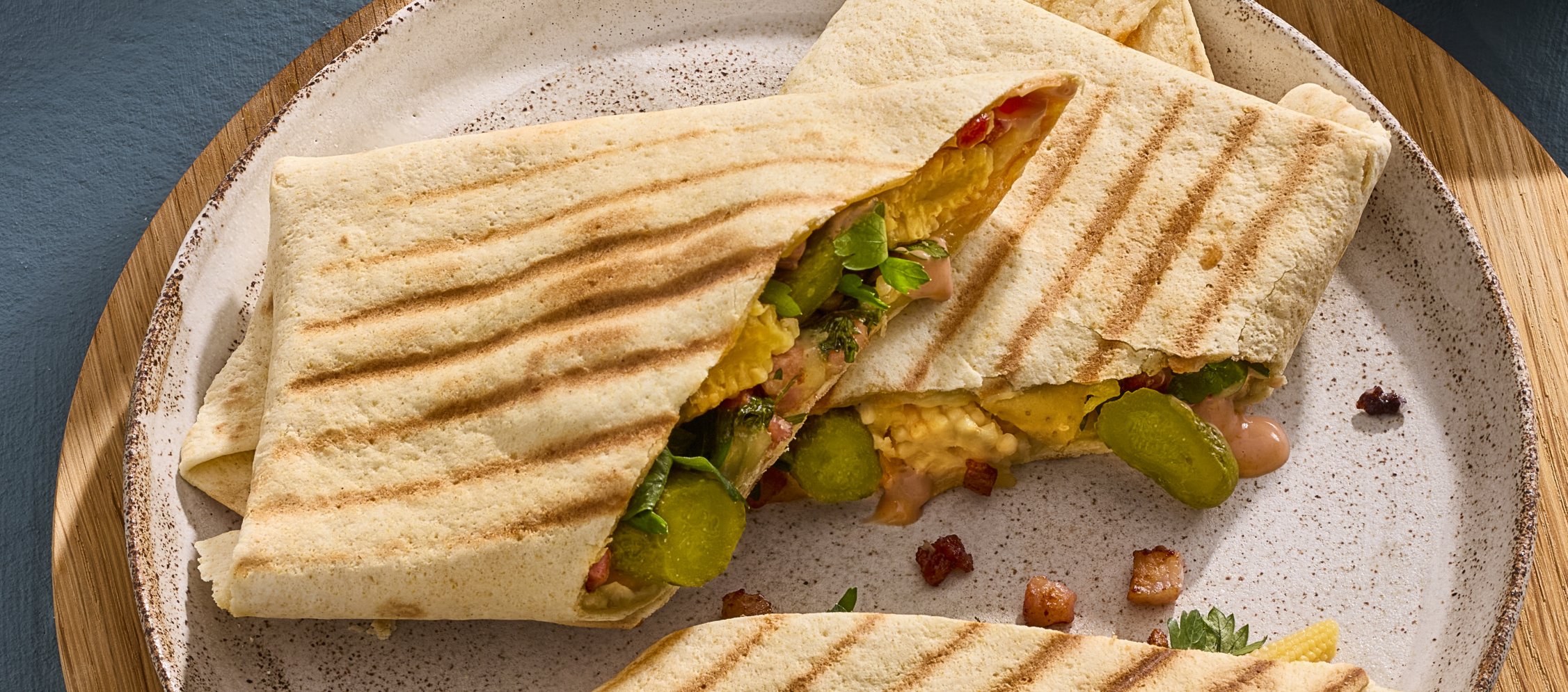 Das Ganze mit einer weiteren Scheibe Raclette-Käse belegen. Den Wrap an den Seiten einfalten, zusammenklappen und auf einem Kontaktgrill für 2–3 Minuten knusprig anrösten.