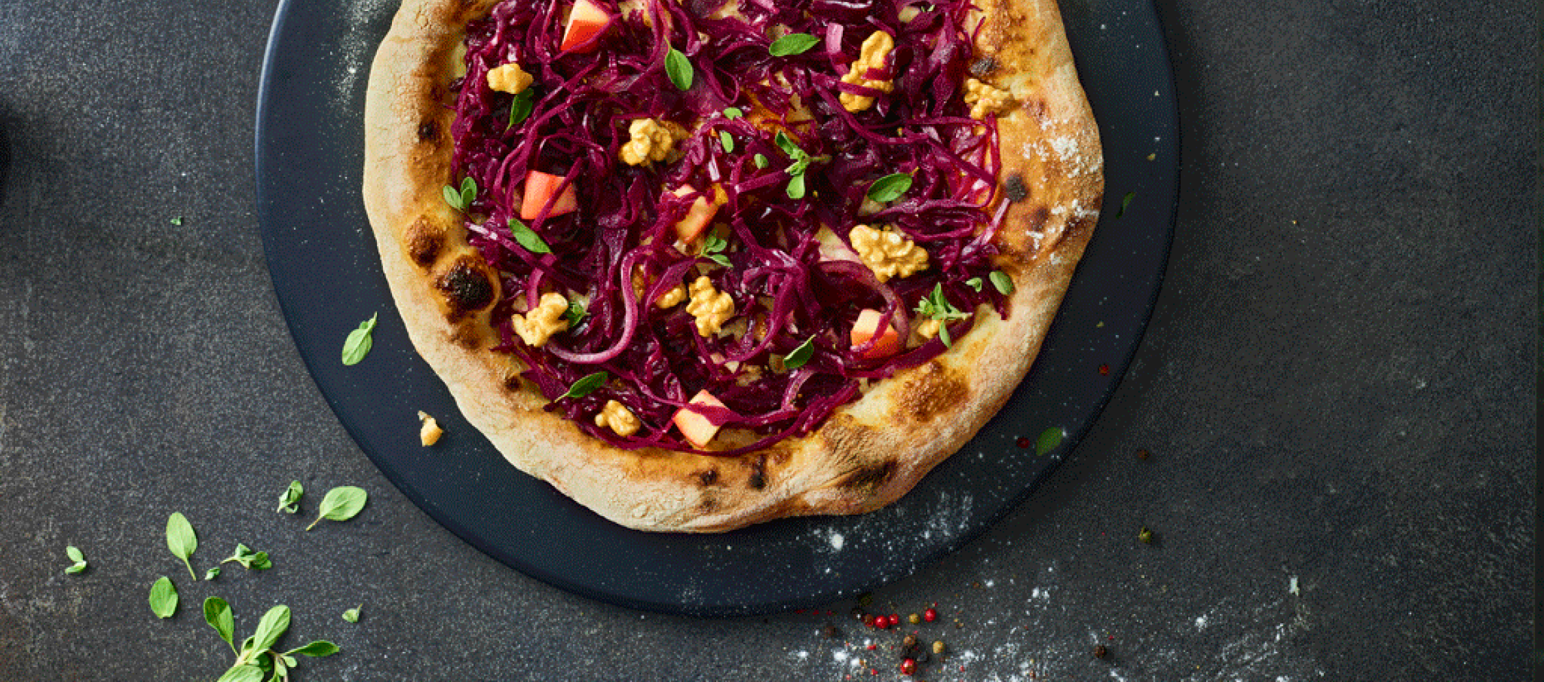Pizza mit etwas Crème fraîche bestreichen, abgetropften Rotkohl darauf verteilen und mit Apfel und Zwiebel belegen. Pizzen jeweils ca. 3–6 Minuten backen. Anschließend die Pizza mit gehackten Nüssen und frischem Majoran getoppt servieren.